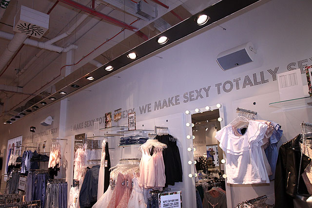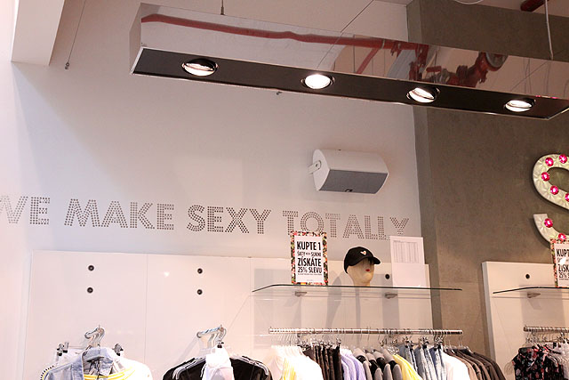 Prodejna módního oblečení TALLY WEIJL v pražském Centru Černý Most je nově osazena reproduktory AT-07 z řady Arc-Series. Kvůli lepšímu pokrytí prostoru jsou orientovány horizontálně nad výstavními regály. Každý reprobox je otočně uchycen na nástěnném držáku QAT-07.