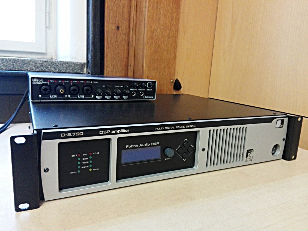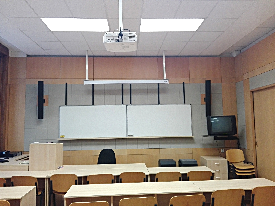 Hlavním kritériem při výběru reprosoustav byla srozumitelnost mluveného slova. Místnost je však určena i pro poslech hudby a proto byly na ozvučovací systém kladeny přísné nároky. Pro tyto účely byla zvolena „mini line array sestava“ Fohhn LX 100 (2 ks) ve spojení se zesilovačem Fohhn D-2.750. Zesilovač má vestavěný zvukový procesor (DSP) , který obsahuje presety pro specifické nastavení konkrétních modelů výrobce. Vzhledem k unikátní konstrukci s osmi středobasovými reproduktory o průměru 4“ umístěnými nad sebou + samostatným výškovým driverem je dosaženo horizontálního vyzařovacího úhlu 140°. Takto je celá plocha místnosti rovnoměrně pokryta a na všech místech posluchárny je zajištěna perfektní srozumitelnost.
